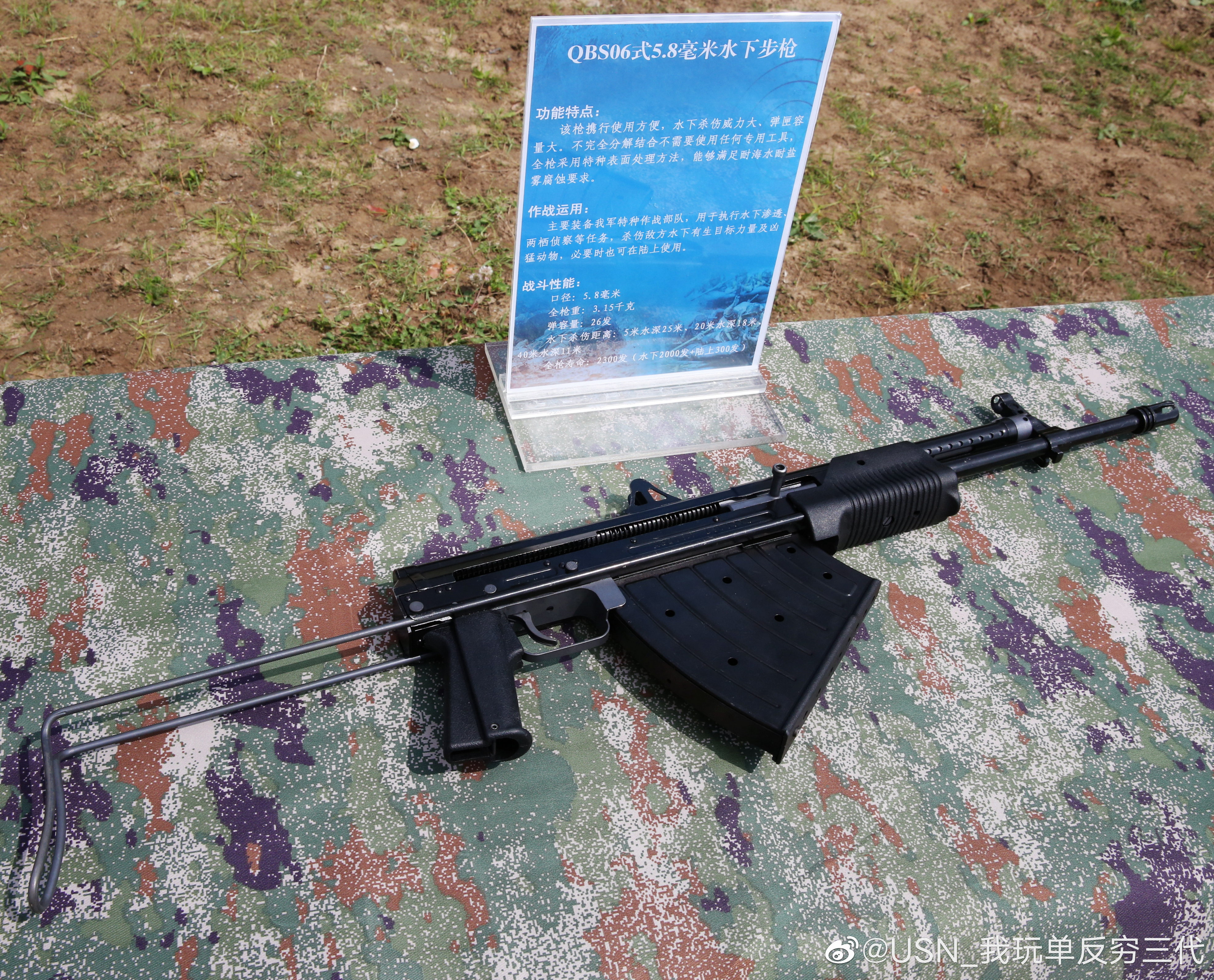 关于国产水下步枪和手枪的流言,其实已经有好几年。据说这是通过对俄罗斯的APS和SPP-1的实物进行测绘仿制而来的。水下步枪的口径为5.8mm,在2010年1月23日CCTV的一个节目里也有过不甚清晰及全貌的镜头。后来在中泰联合军演的武器展示台上也曝过光。可是居然没记者注意到这把枪去拍摄更多的细节