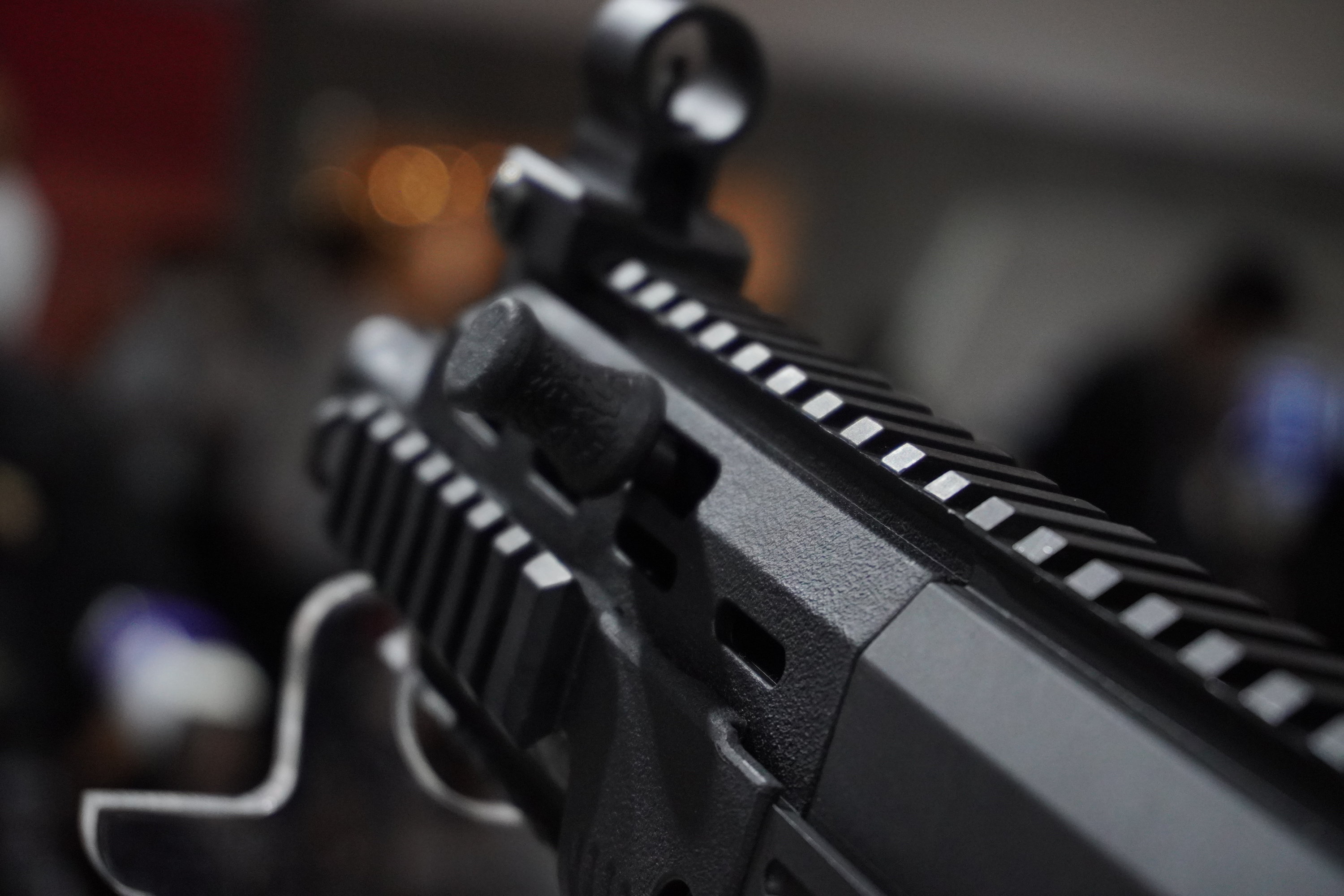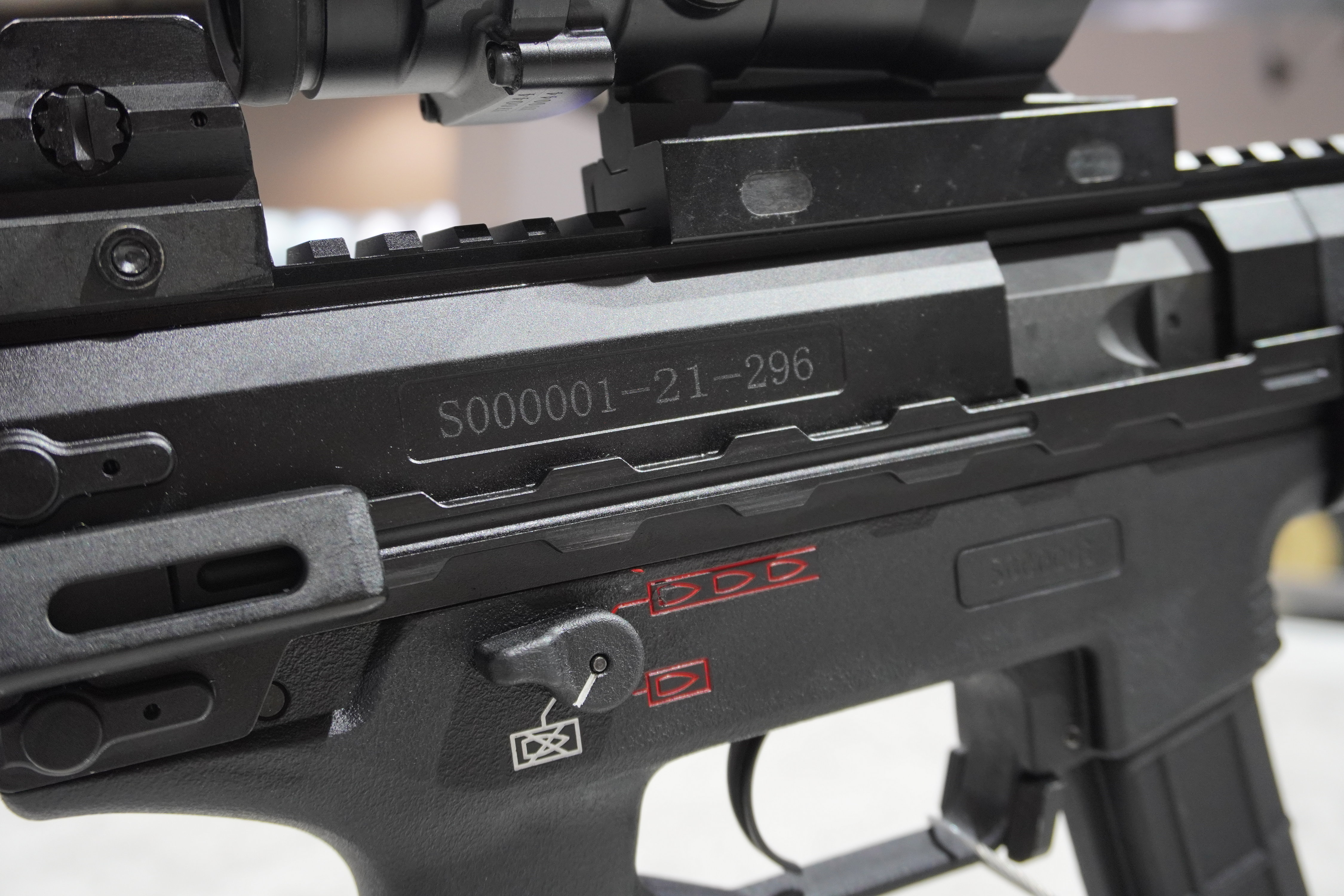 早期曝光的型号中,拉机柄应该可以左右互换,因为在护木上方,两侧位置都有完全相同的拉机柄活动槽。但最近曝光的一种护木上,左侧的拉机柄活动槽被取消。
