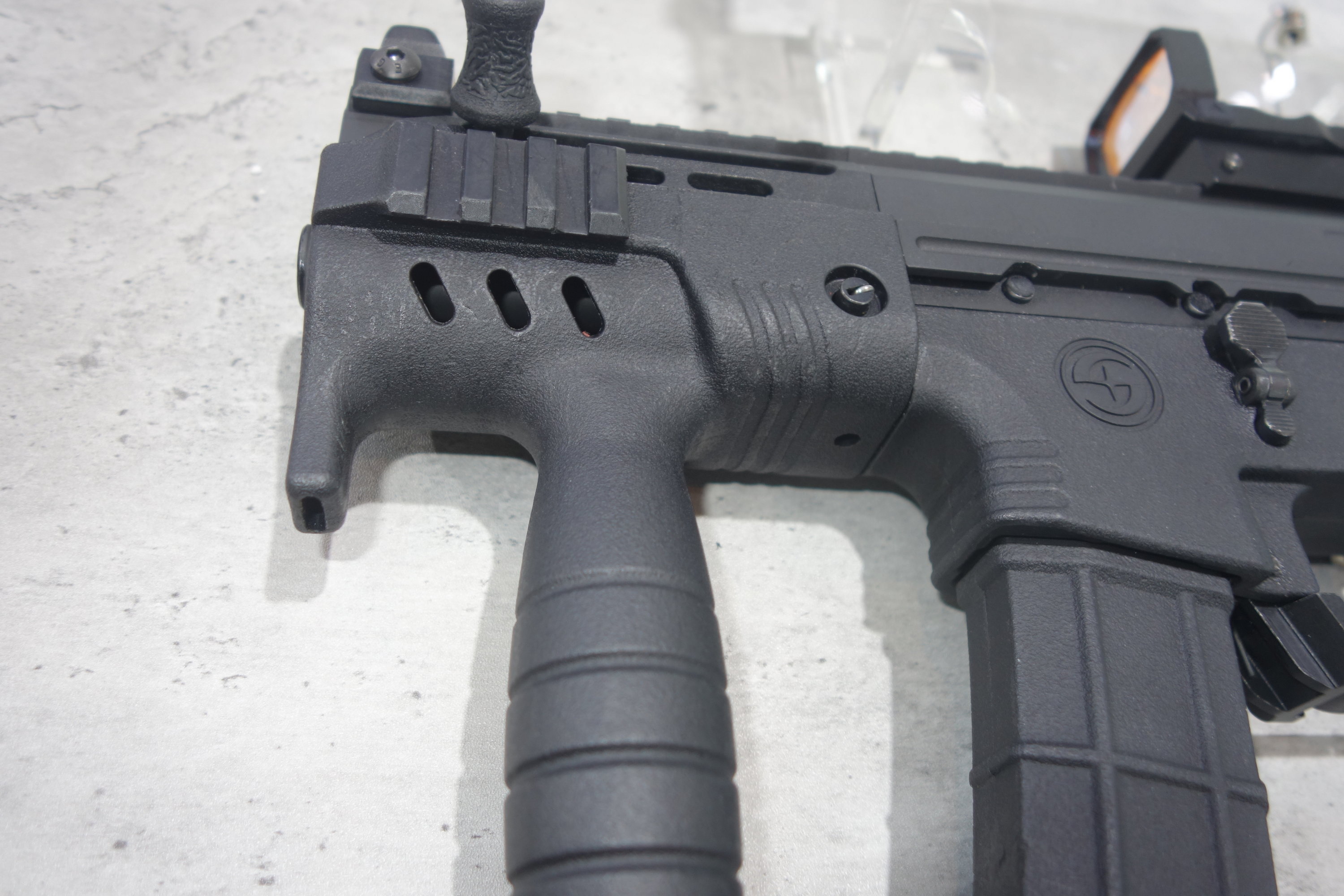 较早时曝光的CS/LS7,顶部的全长式导轨延伸至准星座,护木的3、6、9点位置也有固定导轨,护木上的导轨是整体注塑出来的,并不是加上去的