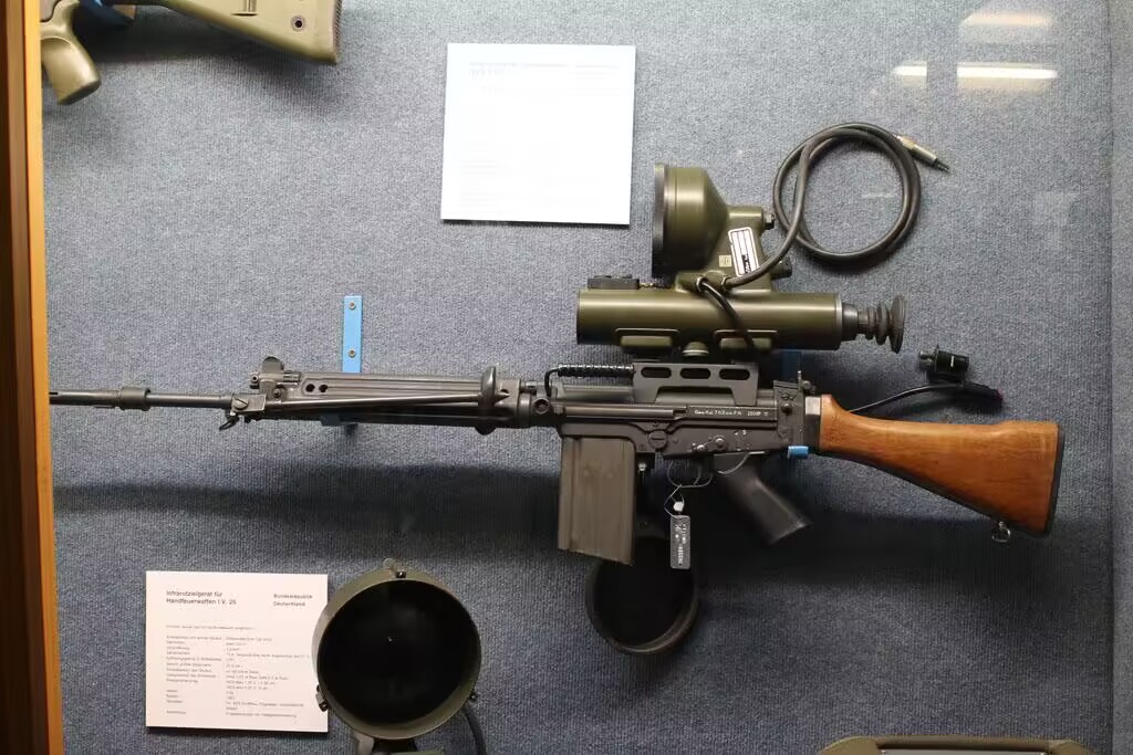 FN公司接到第一份来自德国的FAL订单是装备边境保安警察的,是采用美国设计的五叉式消焰器和镀铬击锺/阻铁的“加拿大式步枪”。在1956年,联邦德国国防军重建,由于当时德国军工业没有恢复过来,因此西德军队在11月订购了FAL步枪,并命名为G1。但G1的变化更多,在外观上有较大的区别。G1采用上下两件式的拉壳钩、增强的击针、带纵向凸筋的金属护木和整体式两脚架,消焰器也是重新设计的,此外德军还要求把瞄准基线降低3毫米,据说这样可以使抵肩射击时贴腮更牢固,便于提高射击精度,也有助于控制后坐力。G1的一些改进影响了FN FAL在1956年的最终定型设计,不过西德军队装备G1不到3年时间就被HK公司生产的G3所代替,据说是因为念旧的比利时人还记住被德国侵略的经历,因此拒绝了西德购买FAL生产许可证的请求,总之最后西德购买了西班牙赛特迈步枪的生产许可证,并演变成了G3步枪。假如比利时允许西德生产FAL,也许FAL会取得更大的成功,但由于比利时人的固执,结果使G3成了FAL在国际市场上最大的竞争对手。