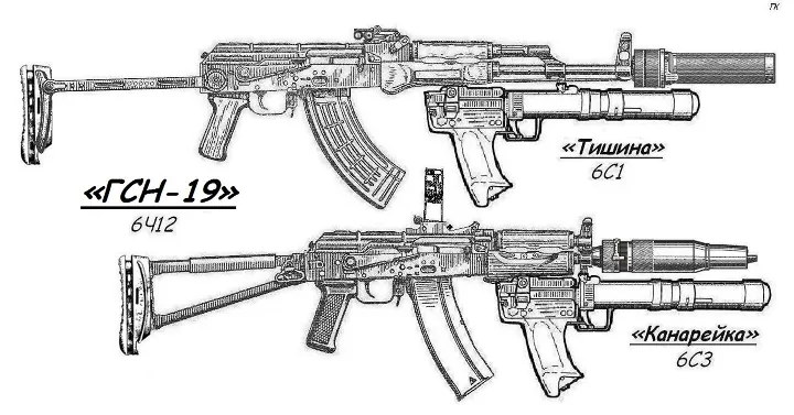 用于AKM的BS-1系统,是包括了GSN-19 Kanarejka(炮兵总局的装备定型为6Сh12)枪挂式榴弹发射器、专用的表尺、PBS-1消声器和7.62×39mm亚音速弹组成,连同枪械在内的整个系统的装备命名为6C1 Tishina(意思是“沉默”);用于AKS74U的BS-1系统,则包括了GSN-19枪挂式榴弹发射器、专用的表尺、PBS-4消声器和5.45×39mm亚音速弹组成,全系统命名为6C3 Kanareika(意思是“金丝雀”)。通常这两套系统还会配有一个可安装在枪托底板上的橡胶缓冲垫。