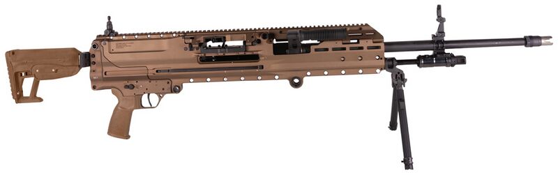 弹链从左侧装入,弹壳和散开的弹链链节从右侧排出。机匣两侧都有拉机柄槽,可由射手根据自己的操作习惯选择拉机柄装在左侧还是右侧。枪身下方可挂上随枪将硬式弹链袋,弹链袋的容量有30发、50发或100发三种。另外也可通过安装在车辆上的大容量弹箱的柔性输弹槽供弹。为方便安装在车辆上使用,SIG MG-338机枪具有与M240机枪相同的枪架接口。但在活塞筒上也固定了轻型两脚架,两脚架可调整长度。枪托也可调节长度,不使用时还可折叠以缩短携行长度。由于.338 NM弹的枪口冲击和声光特征都较为强烈,所以还建议安装SIG自己的NGS消声器(Next Generation Suppressor)。