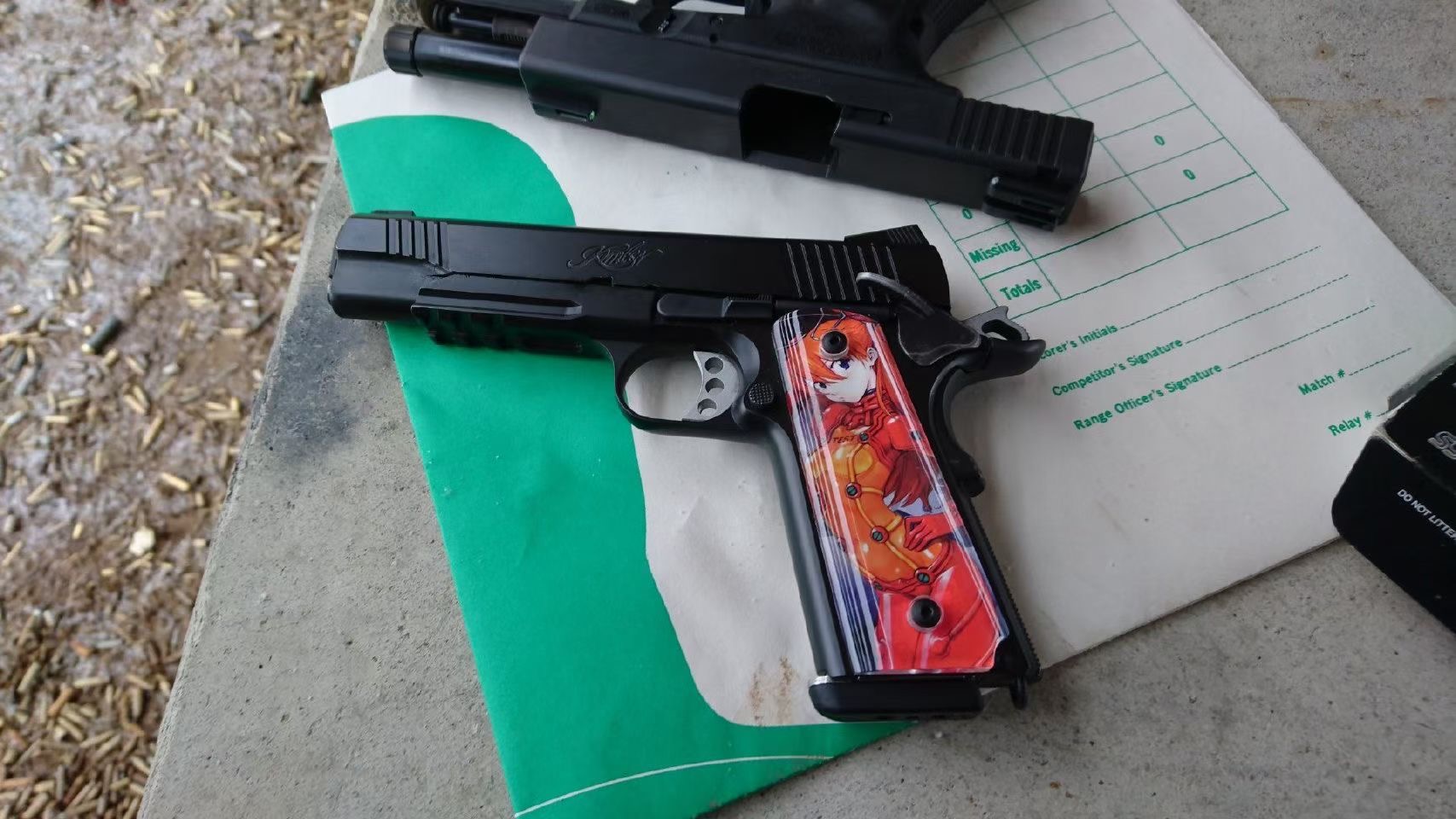 LAPD SWAT在2009年开放日上展出的1911手枪,橙色握把片的是COLT旧枪,黑色的就是KIMBER TLE II