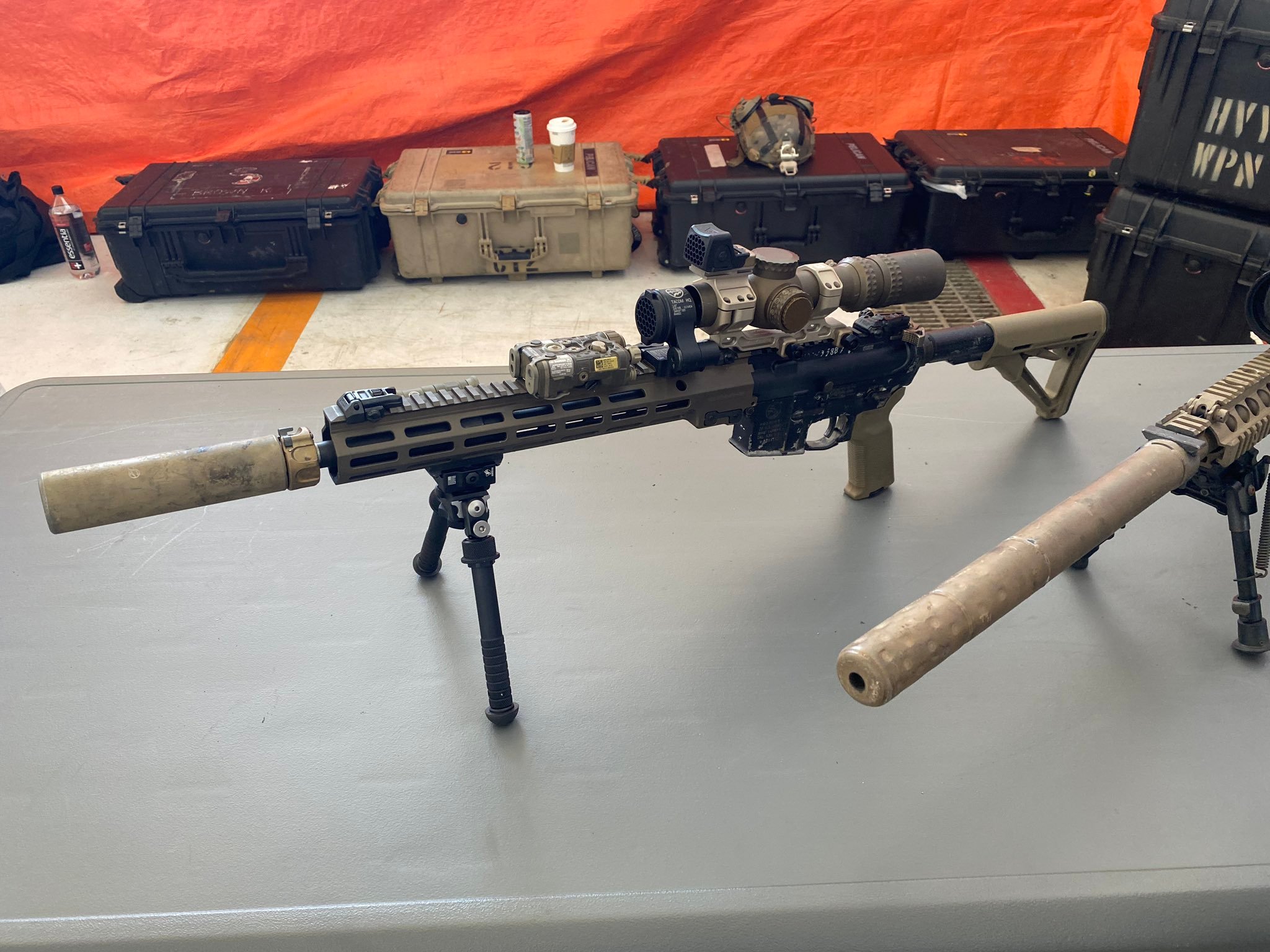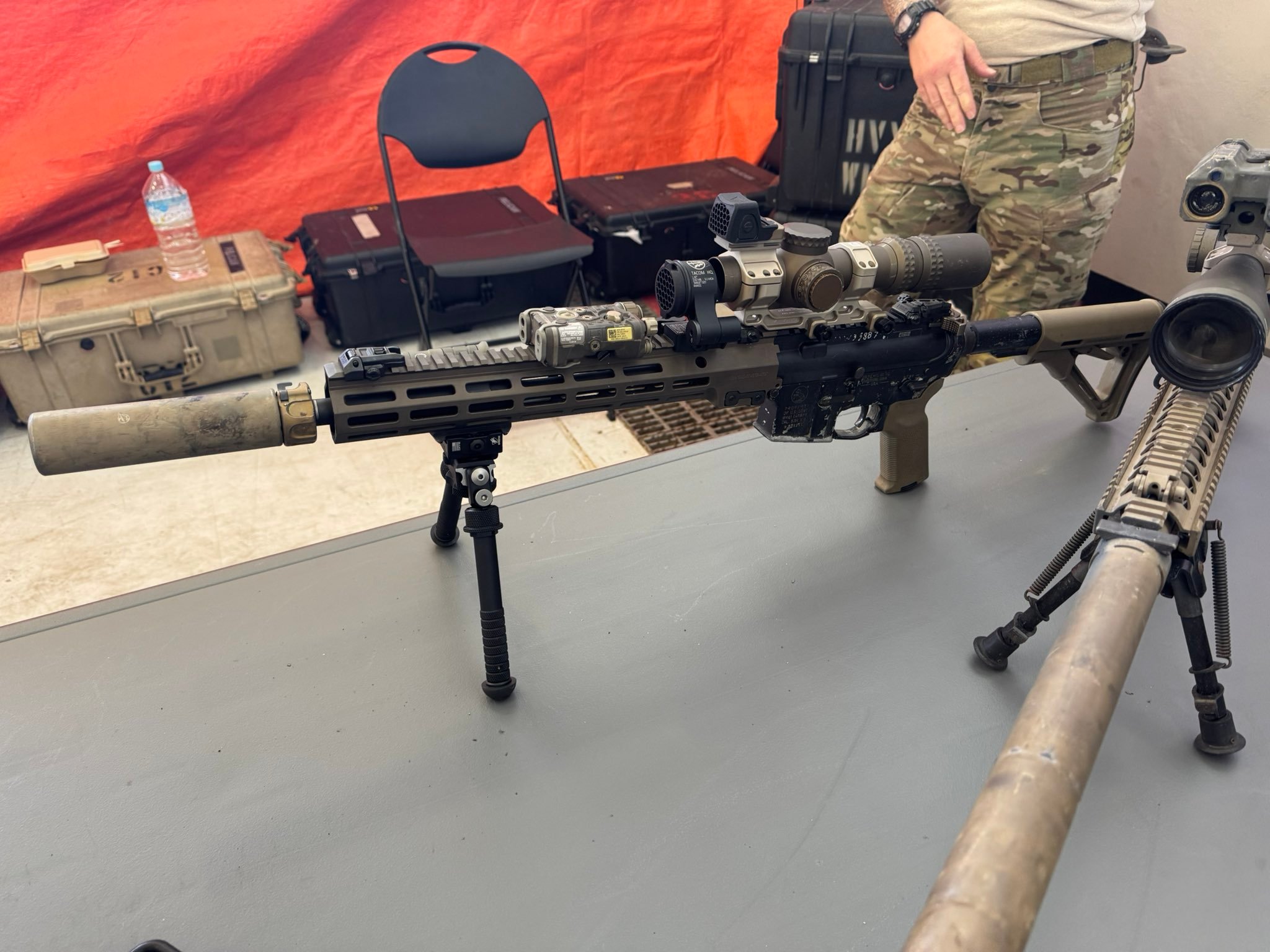 其实 陆军型和海军型的主要部件都是一致的:同样是DD枪管、Geissele护木,枪口安装SureFire的4叉型消焰器,并配SureFire SOCOM消声器,拉机柄 都是是Geissele公司的暗金色Airborne双面拉机柄,后备机械照门是Matech的,准星则是KAC的。陆军型和海军型不同的地方在于搭配的M-LOK配件 数量:陆军型是每一套配3个Magpul的7槽铝合金导轨及1套Magpul QD M-LOK背带环;而海军型则是2个Magpul的7槽铝合金导轨,1套Magpul QD M-LOK背带环,1个Magpul战术灯橡胶开关安装板、以及2片Geissele导轨护盖。