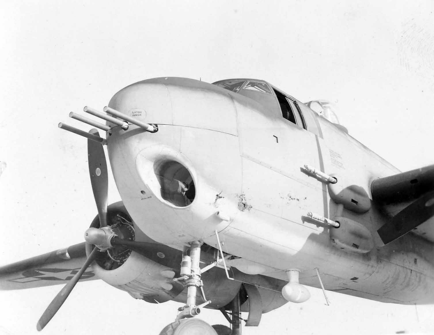 不同型号的B25,机鼻武器有安装在活动射架上的M2,也有固定安装航向射击的M2,甚至还有75mm M5加农炮(B25H)